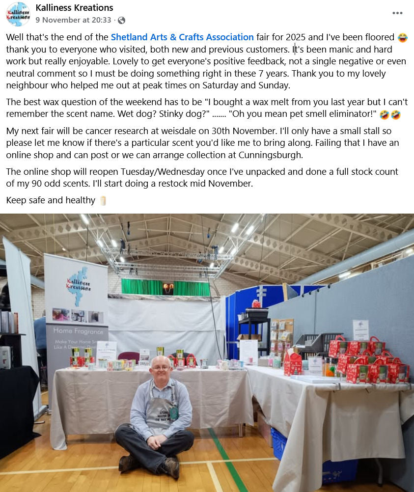 Kalliness Kreations is a home fragrance supplier based on the Shetland Isles. We supply candles, wax melts, room sprays and diffusers with more products to follow soon. We are CLP compliant and fully insured.